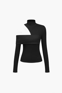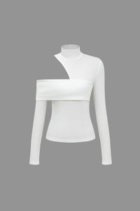Make a statement with the Ivory Asymmetric Luxe Top, where modern design meets effortless elegance. The asymmetrical cut and long sleeves create a sleek, unique look, while the high neckline and soft ribbed fabric offer both comfort and sophistication.